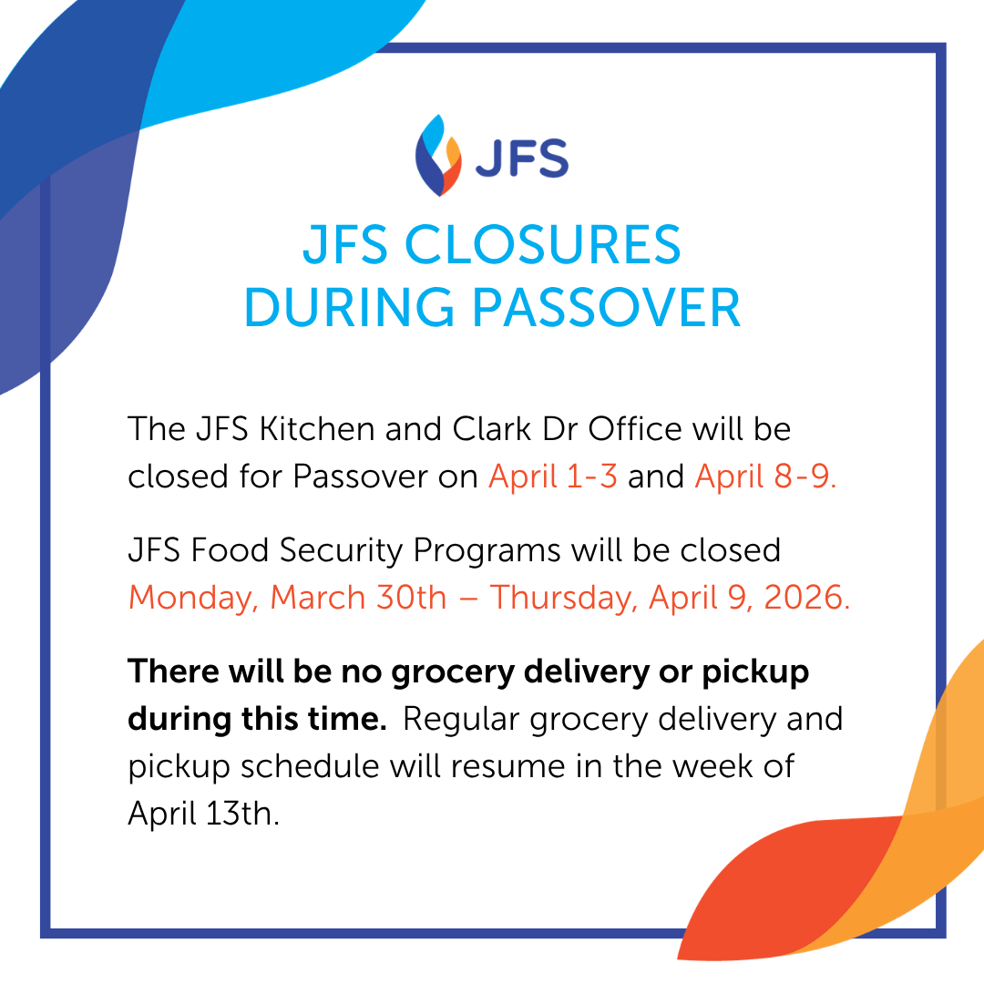JFS Food Security Programs will be closed Monday, March 30th – Thursday, April 9, 2026. There will be no grocery delivery or pickup during this time. Regular JFS Grocery delivery and pickup schedule will resume during the week of April 13th.